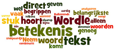 Dat is niet alleen leuk voor de lezer, maar ook voor de schrijver. Je ziet direct of je variatie genoeg in je begrippen hebt, en kunt dus direct synoniemen gebruiken als blijkt dat sommige woorden wel erg vaak in je zinnen verschijnen. Wordle als alternatieve synoniemenlijst, wie gebruikt dat als zodanig? Neem deze blogpost. Als ik hem laat analyseren, komt er als meestgebruikte woord ‘Wordle’ uit. Hmmmm… dus ik heb daarna gauw mijn stuk aangepast. Omdat ik natuurlijk wel wil dat het belangrijkste echt tot uiting komt. Dat tekst niet moet afleiden van de kern. Want de belangrijkste 3 functies van tekst zijn nu eenmaal betekenis, betekenis en betekenis.