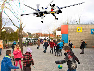 Vorige maand maakte het kabinet bekend dat er met regelmaat drones boven Nederland worden ingezet voor speurwerk naar allerhande politiezaken. We schijnen 75 van die vliegmachientjes te hebben (van het type Raven) die met dag- en nachtcamera’s op pad zijn. Politie leent ze van Defensie om hennepplantages en vermiste personen op te sporen, en voor grote evenementen. Weleens een pauze op een 6x gefuseerde school meegemaakt? Als dat geen groot evenement is, eet ik mijn onderwijs-app op! Een nieuwe groeimarkt dient zich aan, om zonder personeelskosten het schoolplein drugs-, pest- en vandalismevrij te krijgen. Een centraal controlcentrum verdient zich in no time terug met uitgespaarde reparaties en afnemende schooluitval.
